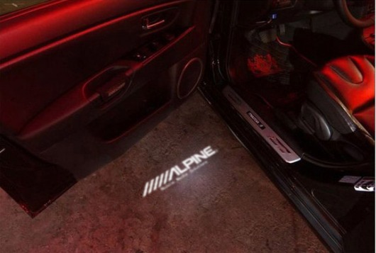 Подсветка с логотипом Alpine — новый нестандартный вариант тюнинга! В дверь авто устанавливается миниатюрный проектор, который выводит на асфальт цветное изображение логотипа Alpine*. Картинка появляется, когда вы открываете дверь, и исчезает, когда дверь закрывается. Выглядит это очень стильно и необычно.