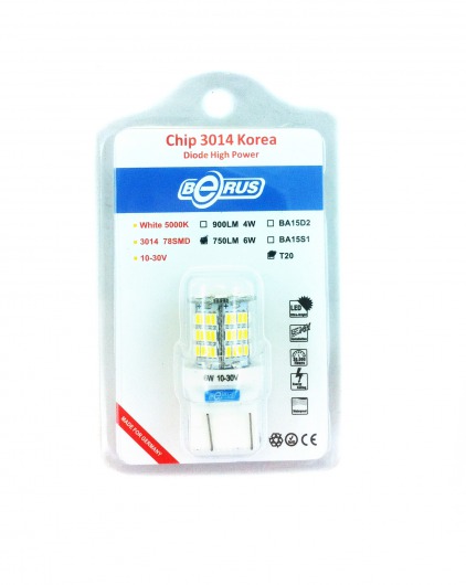 Светодиодная лампа T20 6W предназначена для установки в противотуманные фары и указатели поворотов. Она намного ярче обычных галогеновых ламп, отлично освещает дорогу даже в самую непроглядную темноту и сильный ливень. Цвет свечения со временем не изменяется. Служит такая лампа очень долго, при этом потребляет незначительное количество энергии.