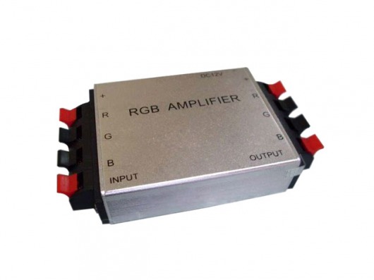 RGB усилитель 02 в металлическом корпусе позволит "разгрузить" RGB контроллер. Т.е. если мощность необходимого метража ленты превышает допустимую мощность контроллера, то к нему можно подключить усилитель. Таким образом, вы можете подсоединить до 20 метров дополнительной светодиодной ленты.