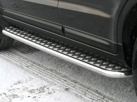 Пороги на Hyundai Santa Fe – это боковые подножки из нержавеющей стали диаметром 42 мм, которые позволяют более комфортно входить и выходить из салона автомобиля. Подножки Hyundai Santa Fe очень прочные, надежные и долговечные: они не боятся коррозии, сколов и царапин и выдерживают большие нагрузки.