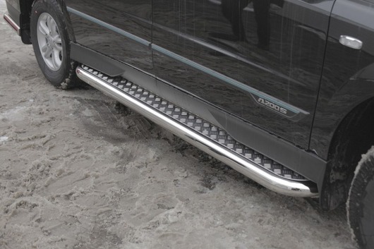 Боковые пороги-подножки сделаны специально для автомобилей SsangYong Actyon Sport от 2012 г.в., поэтому устанавливаются достаточно просто и без повреждений корпуса. Помимо этого, стальные пороги с листом для Санг Енг Актион Спорт смотрятся очень стильно и эффектно. Они добавят вашему авто еще больше солидности и внушительности.