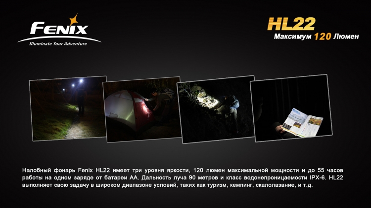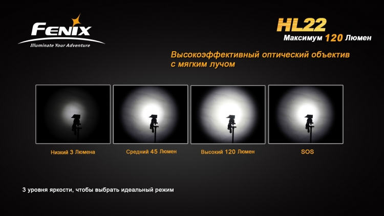 Мощный налобный фонарь FenixHL22 оснащается качественным диодом Creeсо сроком службы до 50 000 часов. Качественный источник свкета и высококлассная оптика позволяет достичь максимальной яркости в 120 люмен и световой луч длиной до 90 метров. Всего же у яркого налобного фонаря 3 основных режима яркости: