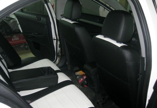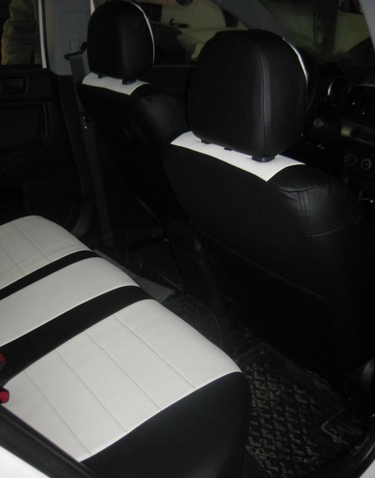 Вопросы и отзывы про Чехлы автомобильные для Mitsubishi Lancer X, седан, 2 л., от 07 г.в. (черно-белые, экокожа)