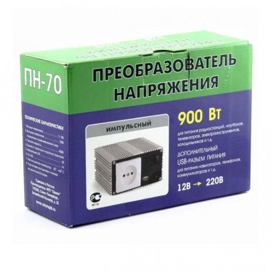 Импульсный преобразователь напряжения Орион ПН-70 900 подключается к «прикуривателю» в салоне автомобиля с напряжением 12В и на выходе выдает эффективное напряжение в 220В. Максимальная мощность - 900 Вт. Инвертор имеет защиту не только от пониженного и повышенного входного напряжения, но и от перегрева, перегрузки, короткого замыкания. Кроме этого, в данном автоинверторе имеется независимый выход питания USB для работы и зарядки портативных устройств.