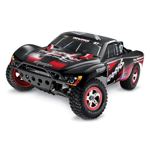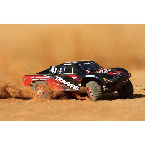 Радиоуправляемый внедорожник Traxxas Slash (TQ) - TRX58034 имеет задний привод. Машина на пульте управления оснащена мощным  электродвигателем Тraxxas Titan 550 12T, регулятором оборотов Traxxas XL-5 и емким аккумулятором NI-MH 8.4v 3000mAh. Это позволяет авто разогнаться до 50 км/ч. Кроме того, дизайн кузова радиоуправляемого грузовика  в точности повторяет оформление реальных автомобилей, участвующих в гонках.
