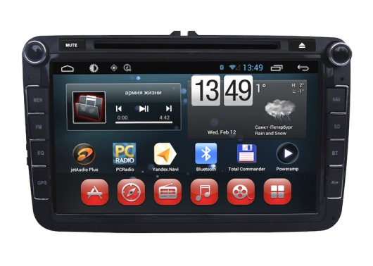 Штатное головное мультимедийное устройство позволяет прослушивать аудиофайлы различных форматов, просматривать видео (в том числе в HD-формате) и фотографии как с внутренней памяти устройства (8 Гб), так и с внешних носителей и SD карт памяти. Вы также можете слушать аналоговое или интернет-радио или смотреть видео онлайн. Или подключить цифровой ТВ-тюнер, чтобы смотреть цифровые каналы прямо на экране устройства. А еще у вас есть возможность подключить DVD-привод и смотреть фильмы и управлять DVD-меню прямо с сенсорного экрана магнитолы.
