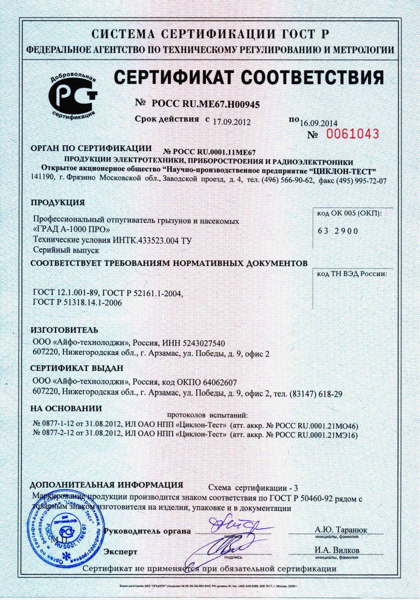 Отпугиватель прошел необходимые проверки и соответствует требованиям Таможенного союза