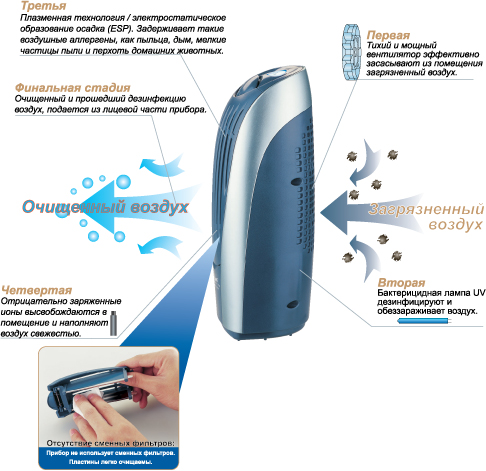 Фильтры не нужно заменять, достаточно протирать их влажной тряпкой по мере загрязнения. Встроенный вентилятор, который обеспечивает циркуляцию воздуха, работает практически бесшумно.