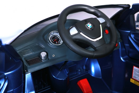 Все детали авто тщательно проработаны и качественно выполнены. А как иначе? Ведь электромобиль изготовлен по лицензии и под контролем компании BMW. Эта модель может похвастаться особенно тщательной проработкой деталей торпедо: здесь и кнопка запуска и выбора скорости, и рычаг переключения хода (вперед/назад), и мягкая неоновая подсветка. Специальное фактурное покрытие руля имитирует кожаную оплетку.