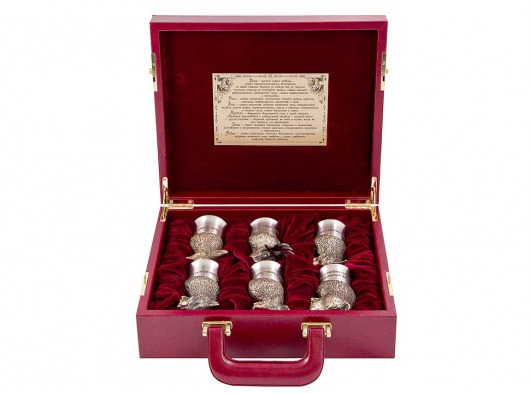 • Мельхиоровые посеребреные стопки-перевертыши украшены золоченой надписью (вы можете заказать стопки с любой именной надписью).