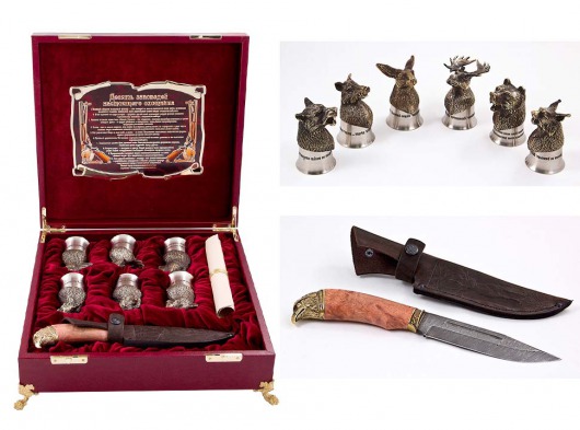 Подарочный набор из стопок-перевертышей и охотничьего ножа поможет выразить ваше уважение к другу, родственнику или коллеге. Личные стопки с именной надписью и настоящий дамасский нож — знак успешности и престижа, который придется по душе любому охотнику.
