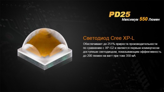 Яркость модели Fenix PD25 производителям удалось поднять до 550 люмен за счет использования современного светодиода Cree XP-L. Его потенциал рассчитан на работу в течение 50 000 ч без существенного снижения яркости. На базе этого светодиода, фонарь работает в пяти режимах, среди которых также и тактический режим Strobe. Благодаря такому функциональному набору, Fenix PD25 отлично справляется с заданиями, которые могут возникнуть во время отдыха на природе: освещение в палаточном лагере, на лесной тропе, подсветка рыболовных снастей на берегу водоема и т.д. С ежедневными вопросами, которые могут возникнуть при использовании в городских условиях, эта модель фонаря также успешно справится.