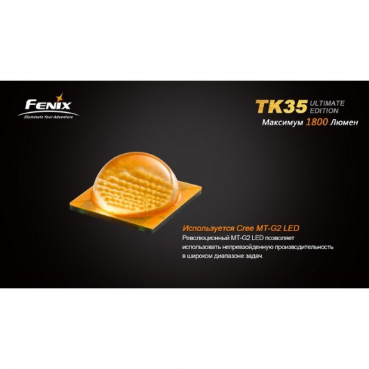 Один из наиболее ярких тактических фонарей под названием Fenix TK35 Cree MT-G2 Ultimate Edition предлагает 1800 люмен освещения всего от 1 диода. Такие рабочие характеристики ему обеспечивает современный полупроводниковый прибор Cree MT-G2. К тому же, это очень долговечный диод, который проработает не менее 50 000 ч. Он воспроизводит белый свет нейтрального спектра, более всего приближенный к естественному солнечному освещению.