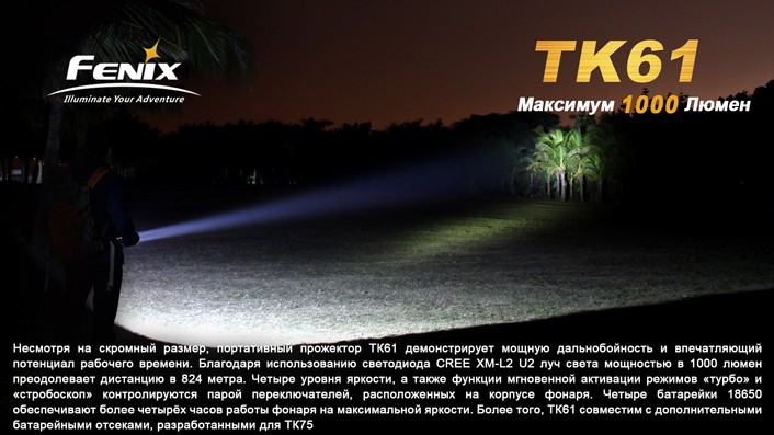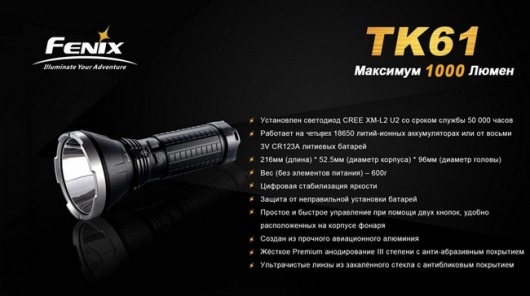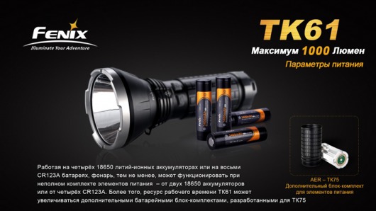 Инструкция по использованию: Батарейная кассета фонаря Fenix TK61 Cree XM-L2 (U2) рассчитана на 4 Li-ion аккумулятора размера 18650 или 8 Lithiium батареек стандарта CR123A. Если вы собираетесь использовать осветительное устройство при низких температурах, лучше использовать именно литиевые батареи, которые дольше сохраняют заряд на морозе.