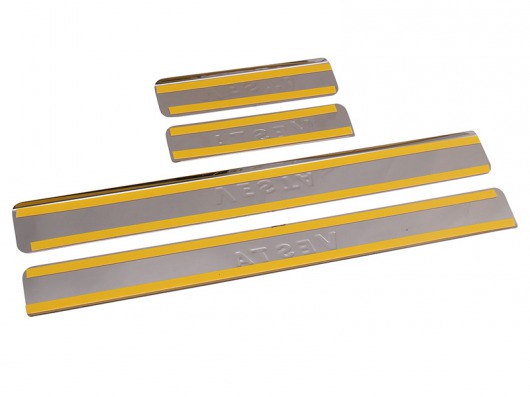 Внутренняя накладка на порог Лада Веста — это аксессуар автомобильного тюнинга, который защищает внутренний порог от механических повреждений при посадке и высадке из машины. Декоративные накладки с логотипом на внутренние пороги предназначены для автомобилей Лада Веста.