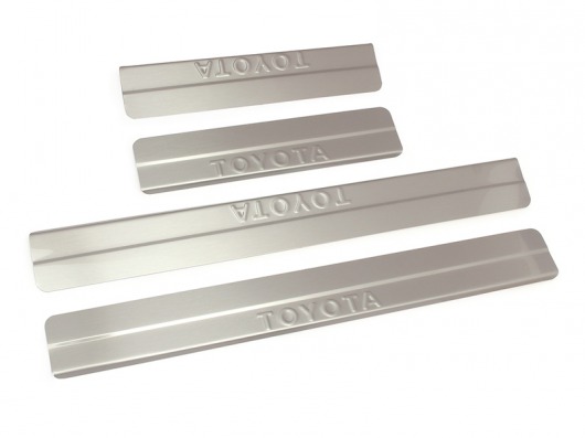 Накладки на металлические пороги дверей Тойота РАВ 4 с логотипом авто не только обеспечивают защиту верхней и боковой поверхности внутреннего порога, но и отлично вписываются в интерьер автомобиля, подчеркивая его стиль и индивидуальность. C монтажом проблем не возникнет: установка накладок на внутренний порог для Toyota RAV4 производится на штатные места с помощью скотча 3M.