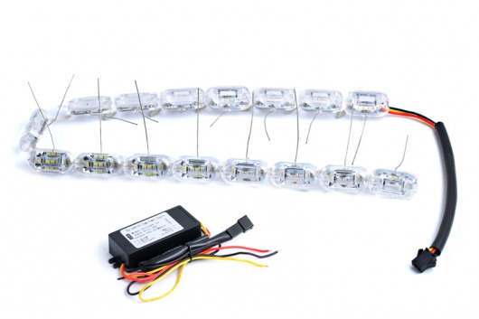 Гибкие дневные ходовые огни (DRL) Optima предназначена для установки в фары автомобиля. Может работать в 2-х режимах: для подсветки и индикации поворота, а также в режиме дневных ходовых огней (DRL). При повороте лента светит желтым светом, при движении прямо — белым. Диодная лента имеет гибкий корпус, поэтому может быть согнута в любом направлении.