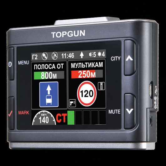 Topgun оснащен сверхчувствительной антенной и встроенным GPS-модулем, благодаря чему Вы всегда своевременно буду получать необходимую информацию, избежав тем самым лишних затрат на оплату штрафов. База GPS-модуля постоянно обновляется.