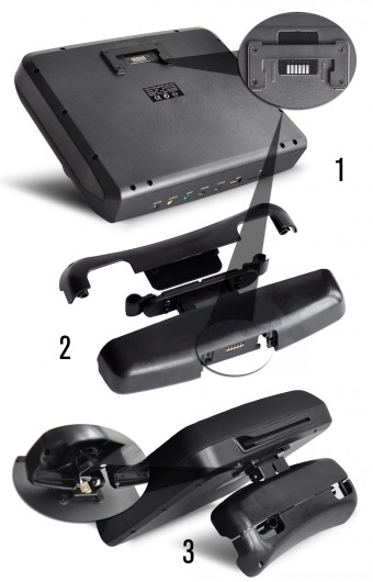 Управление и настройка прибора осуществляется при помощи сенсорных кнопок и пульта дистанционного управления. Этот монитор устанавливается на подголовник за счет специального кронштейна, который имеет возможность регулировки расстояния между креплениями (от 12 до 18 см), что обеспечивает надежную фиксацию на опорах штатного подголовника. В комплект поставки входит особый набор для крепления монитора на ножки, диаметр которых 10, 12 и 14 мм.