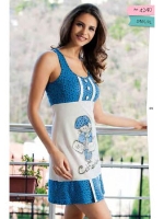 Широкие лямки, открытая зона ворота, длина чуть выше колена, небольшой разрез в передней части. Оригинальный принт.